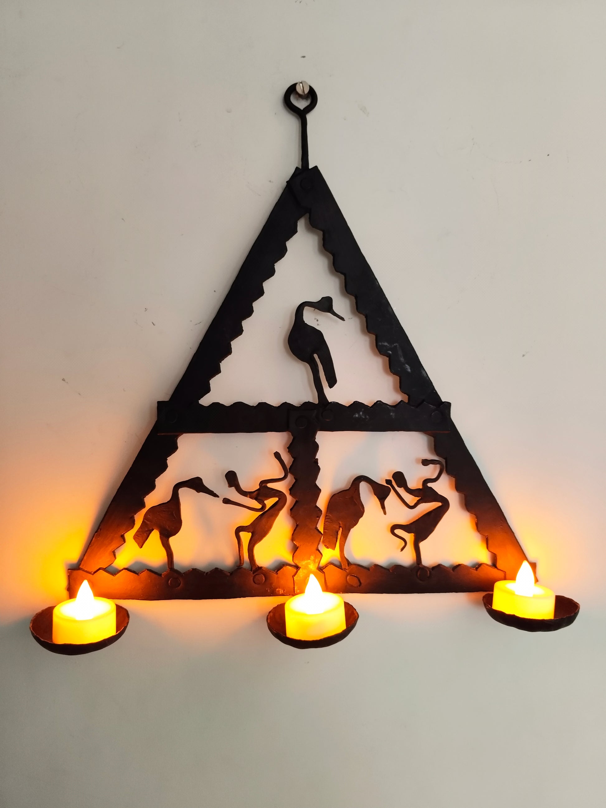 This is a Beautiful tribal craft form beating up wrought iron to give them human and animal shapes that are then welded onto a frame to which diyas (tea-light) holders are added.