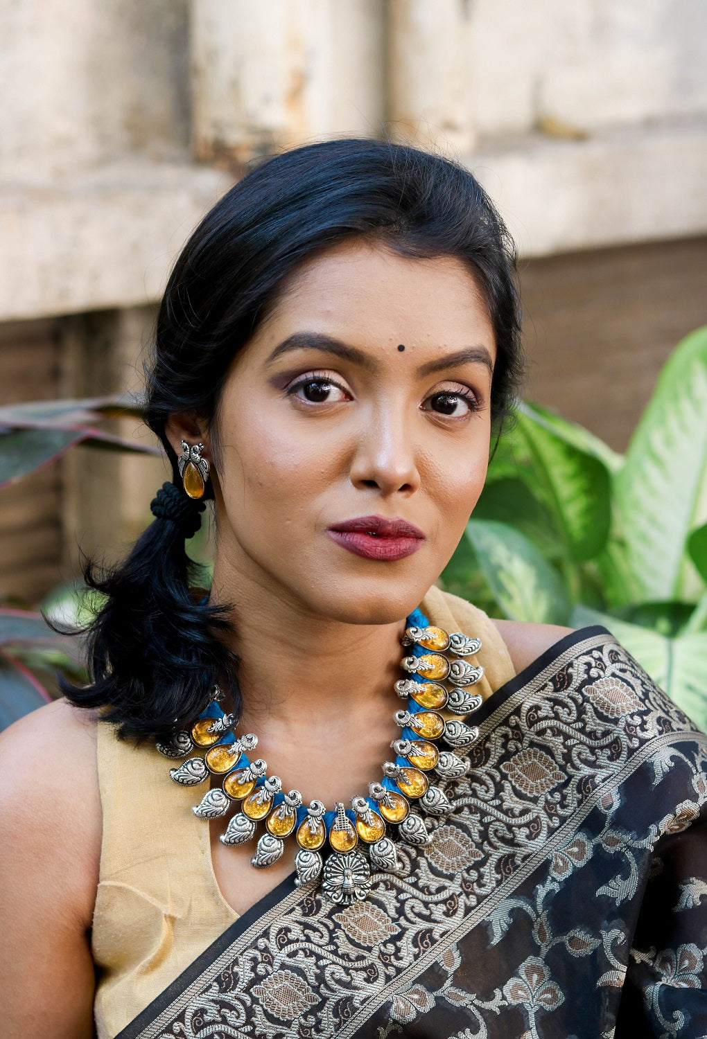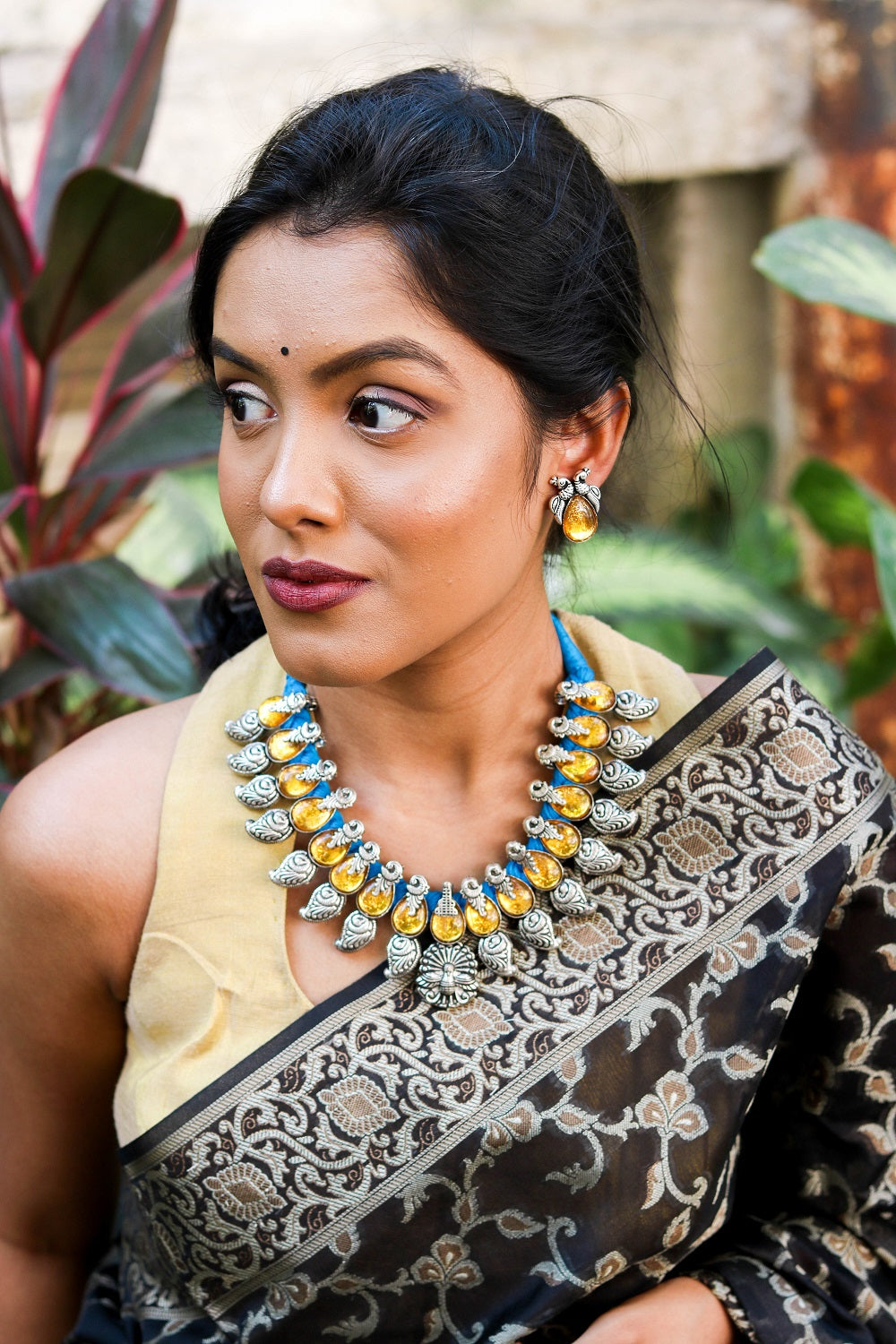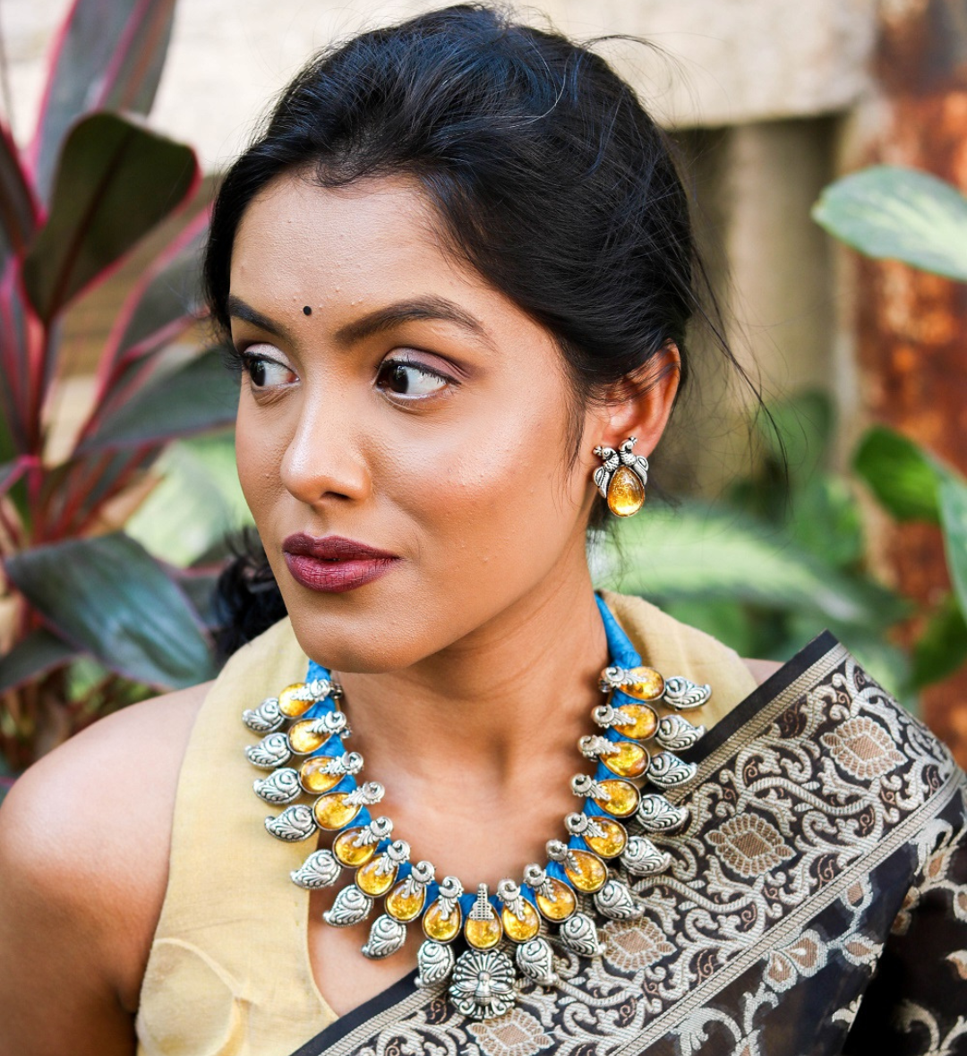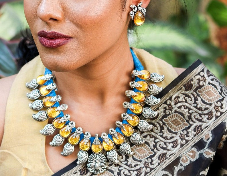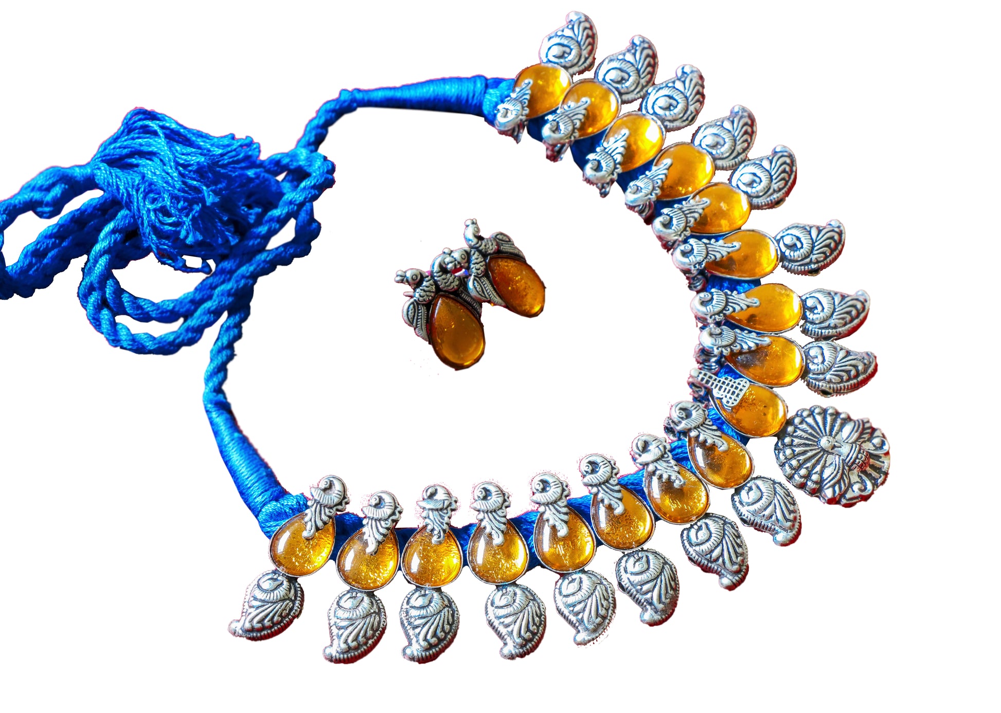 Our amber peacock and blue thread necklace is a stunner given the brilliant contrast much like the sun in the blue sky.