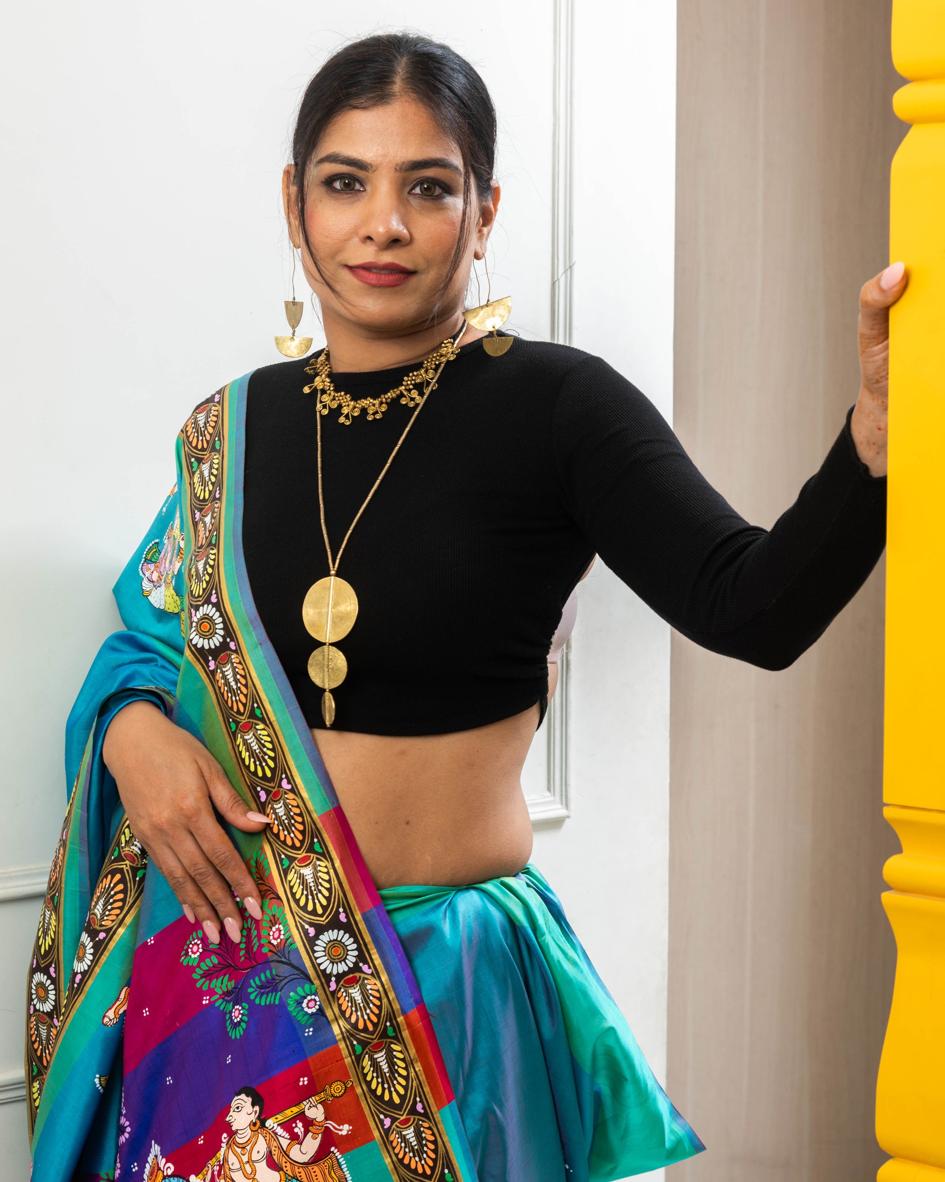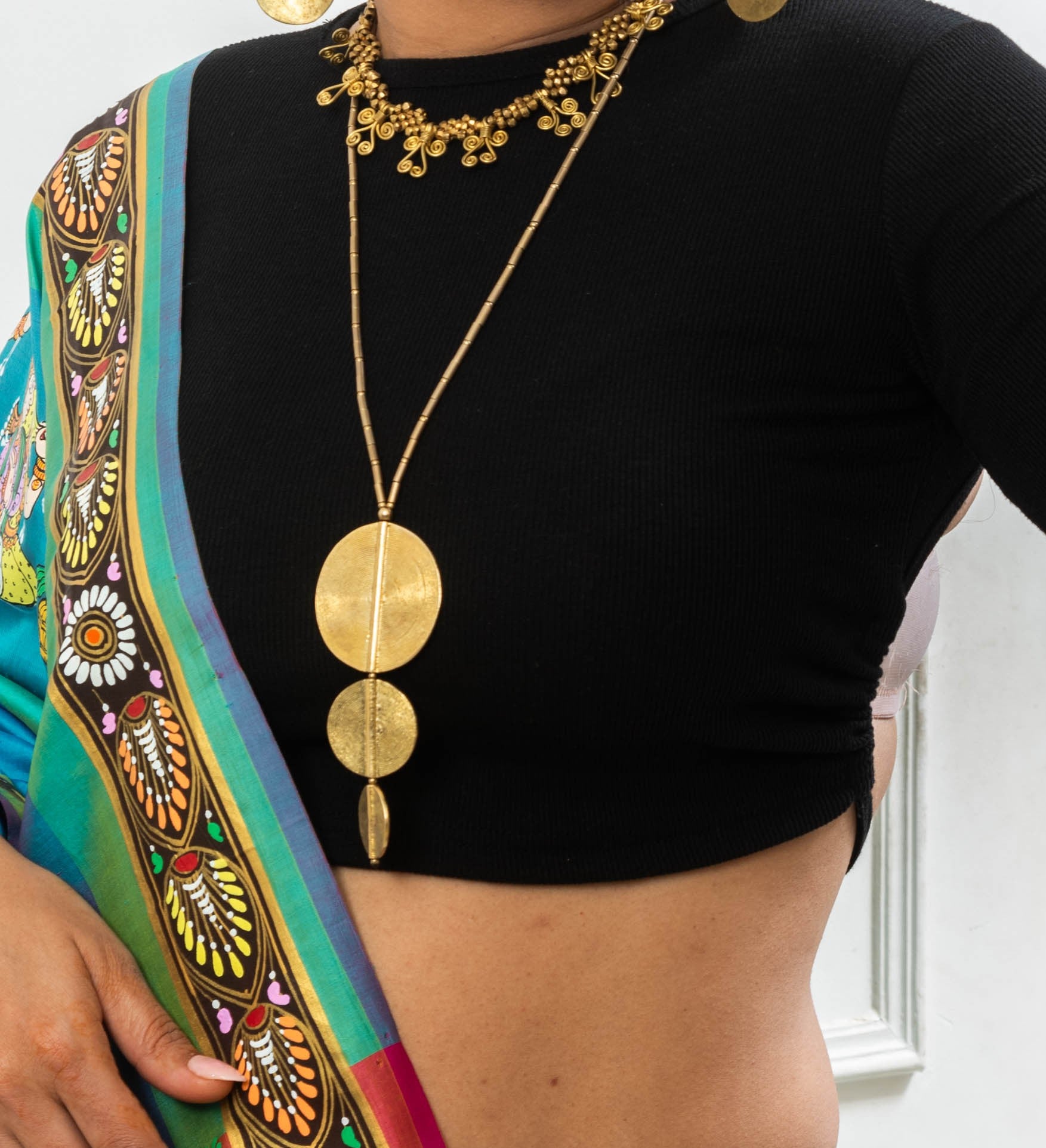 A long brass necklace that's chic and versatile to be worn on western or Indian wear.
