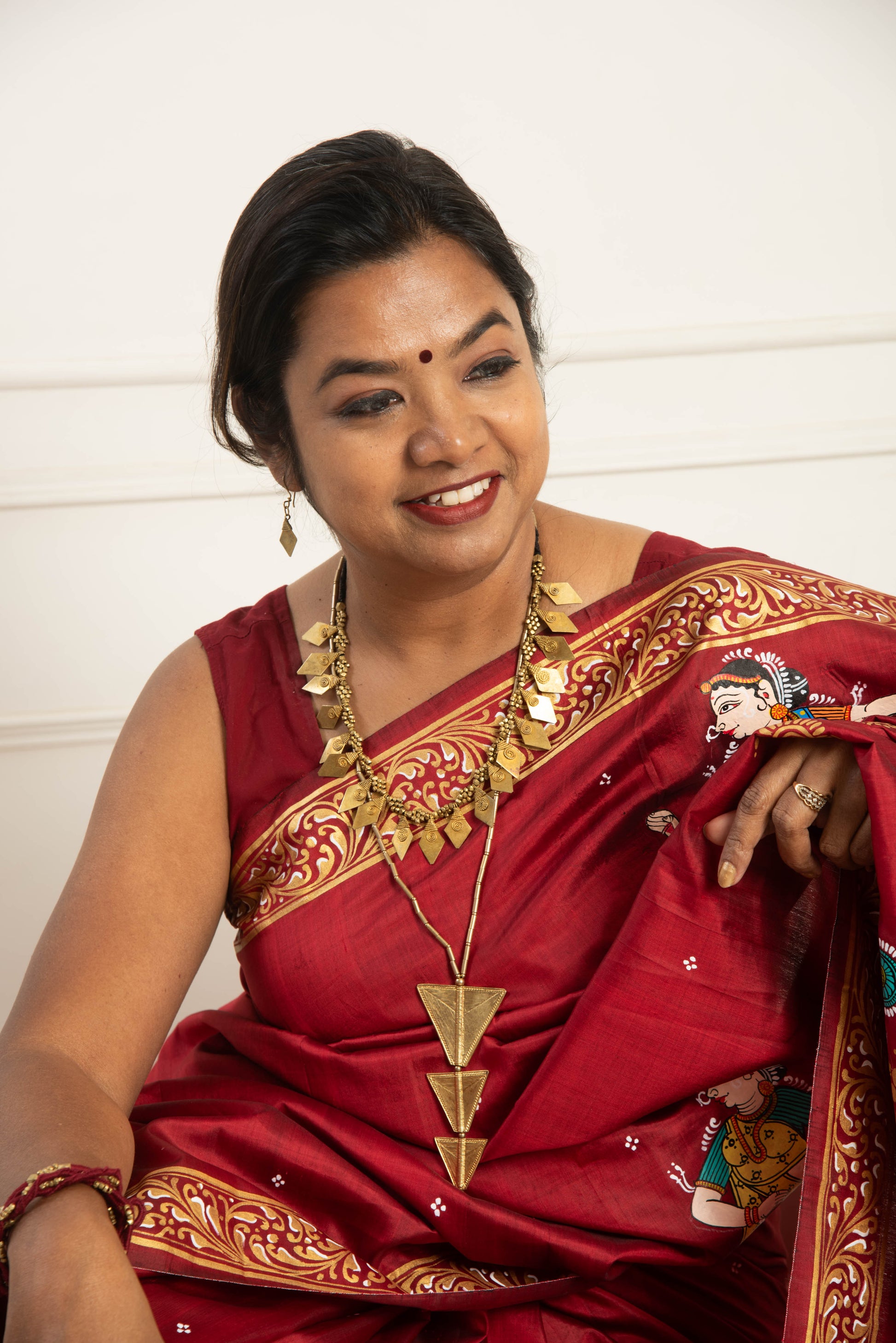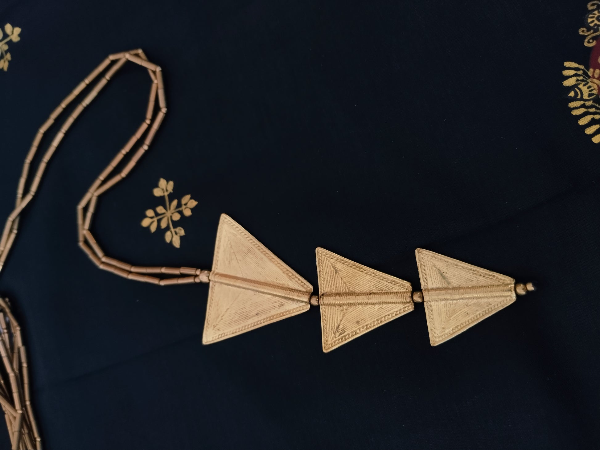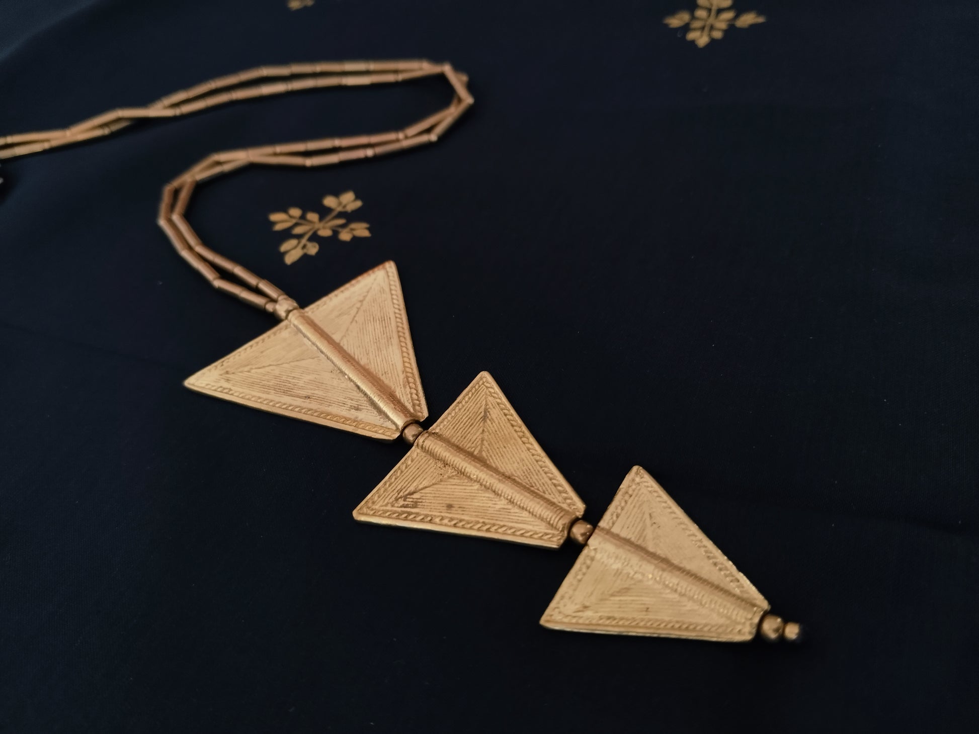 A long brass necklace that's chic and versatile to be worn on western or Indian wear.