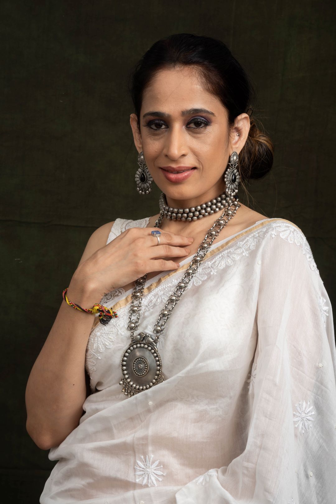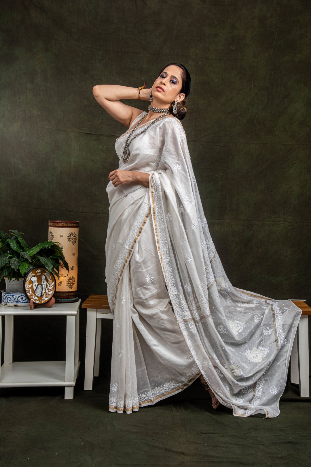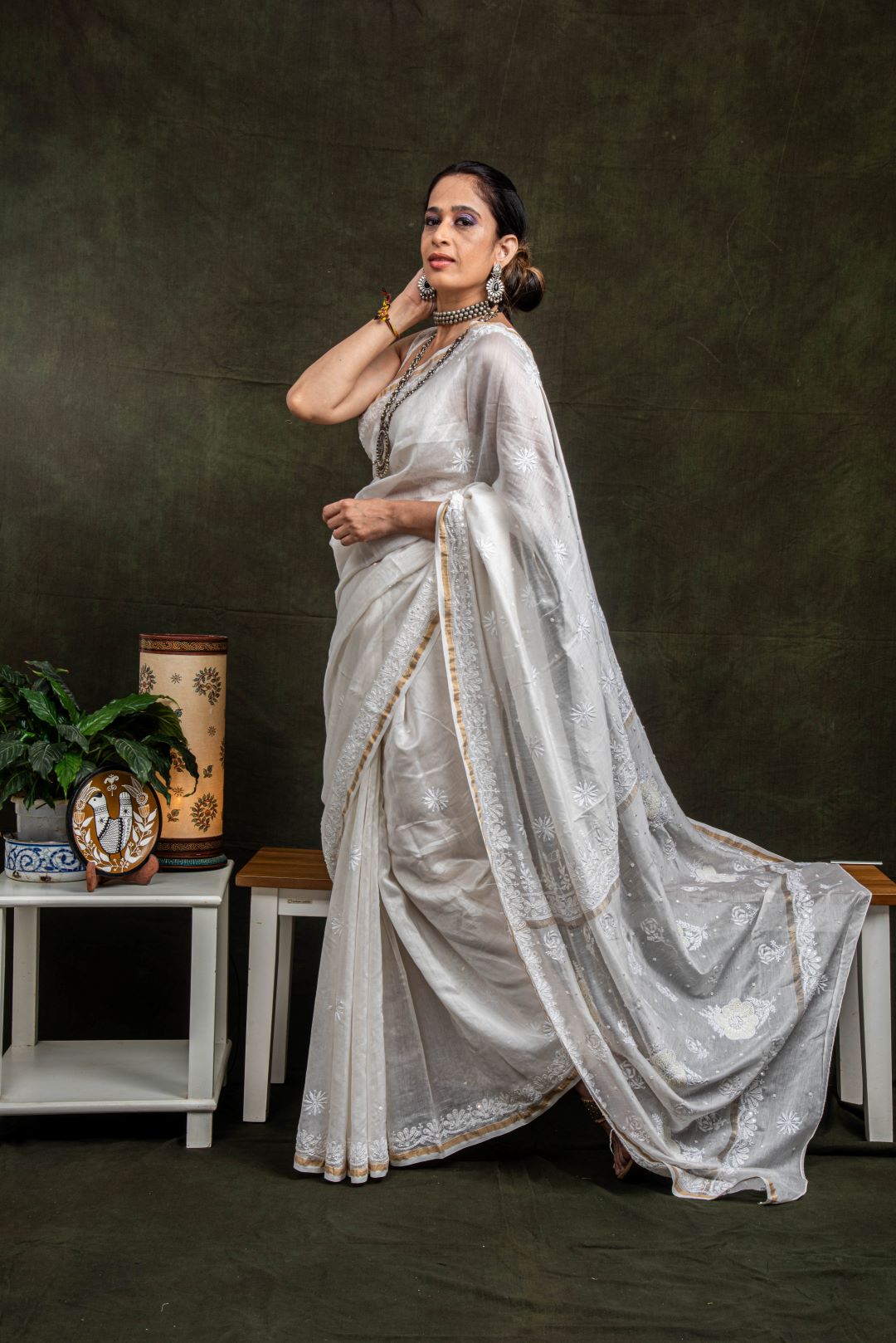 A superbly hand embroidered saree by our women artisans of UP, this is a cotton silk chanderi that's not just comfortable to wear it any weather, but also elegant and classy with hand worked threads and beads in white making this a subtly elegant saree to wear.