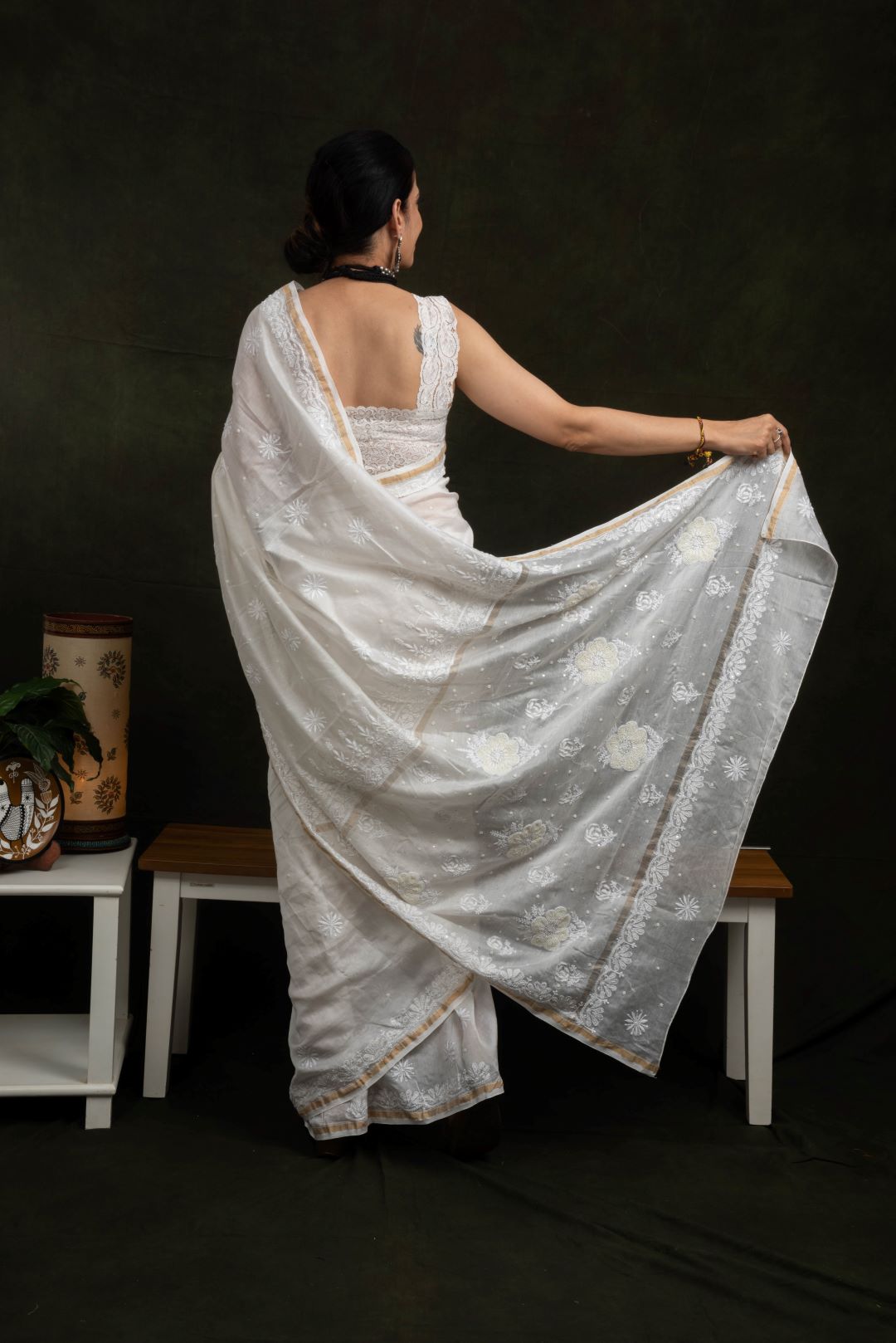White Chanderi Cotton Silk Hand Embroidered Saree - Beaded Flowers