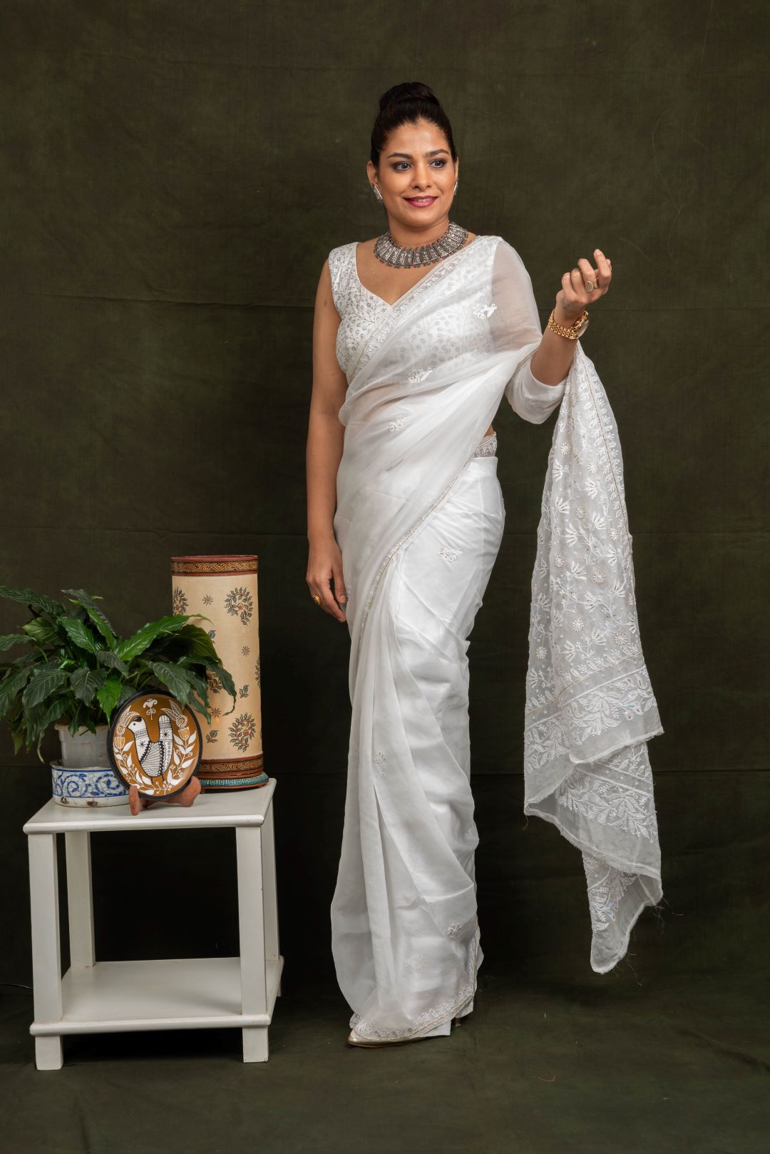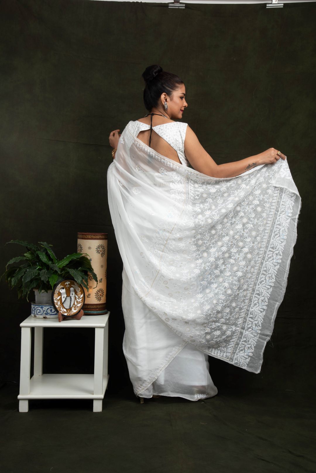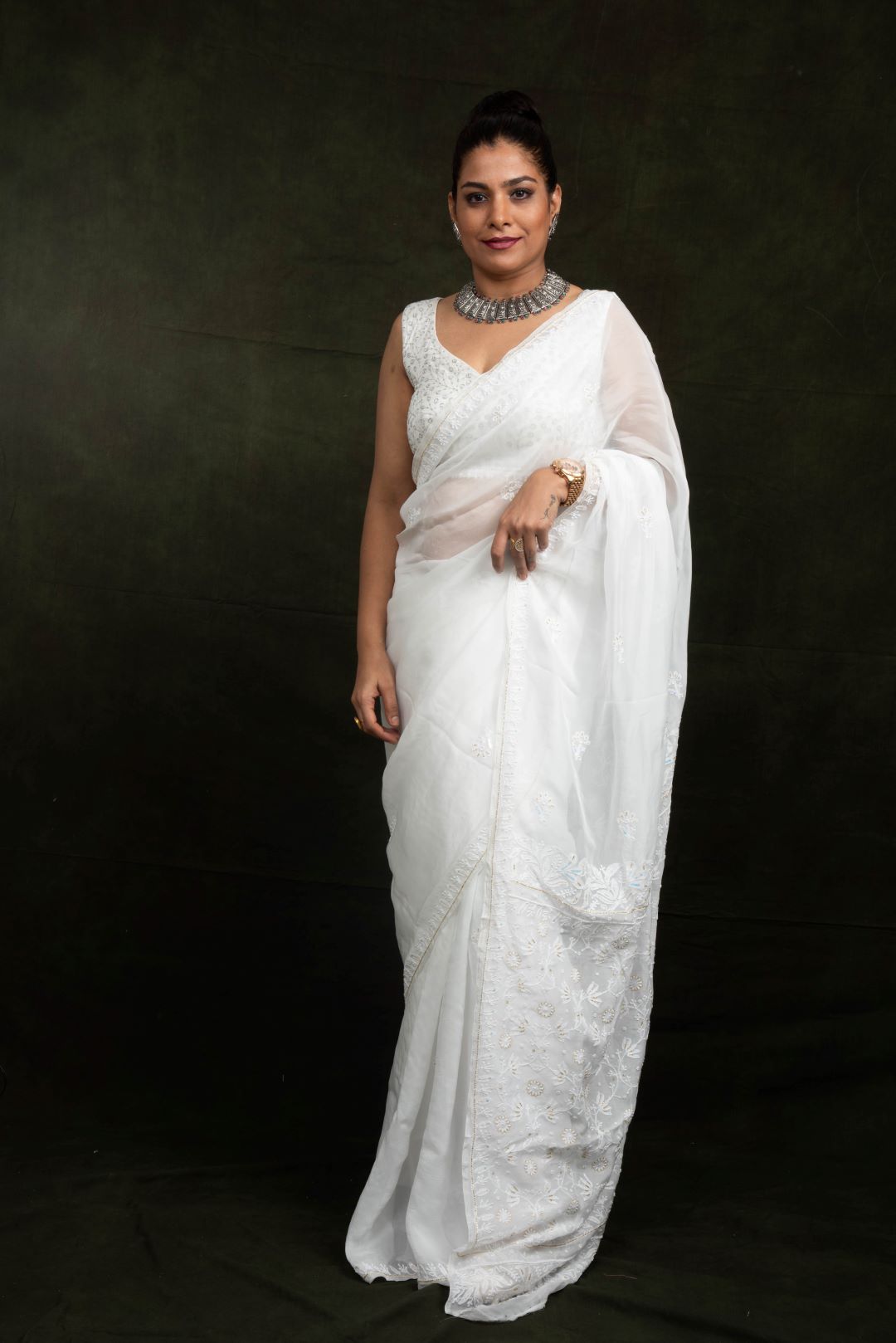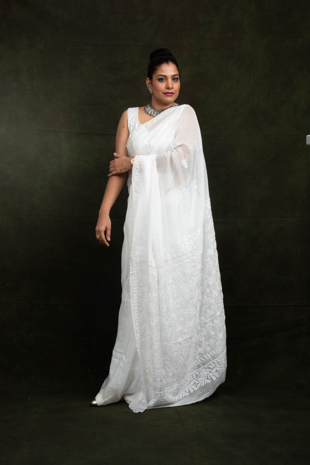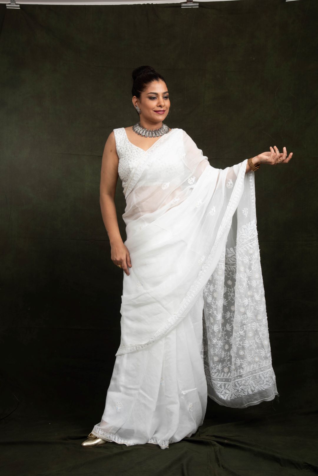 White Organza Hand Embroidered Saree - Flower Jaal