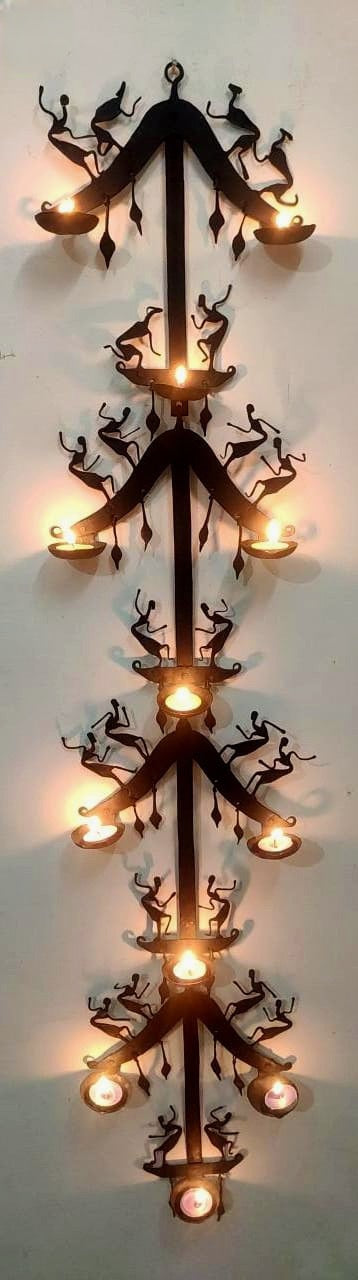 This is a Beautiful tribal craft form beating up wrought iron to give them human and animal shapes that are then welded onto a frame to which diyas (tea-light) holders are added.